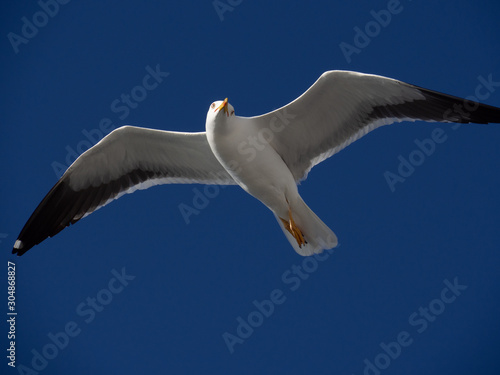 © Dawn, Obraz premium Isolated seagull soaring with blue sky background