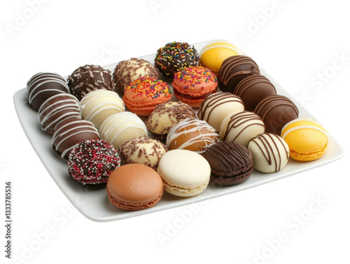 Obraz premium Isolated Selection of Chocolate Truffles and Macarons on a White Serving Plate