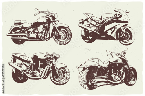 © Oleg, Obraz premium Isolated set of monochrome illustrations of 4 different motorcycles.