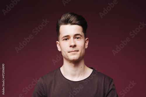 © diignat, Fototapeta premium Isolated shot of young serious handsome male with trendy hairdo, wears casual brown t shirt, has serious expression as listens to interlocutor, poses in studio against crimson background