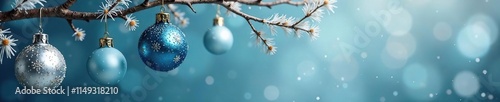 Fototapeta premium Isolated silver and blue spheres hanging from a twigs and branches, festive,...