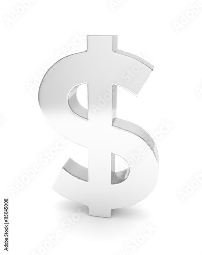 © Natalia Merzlyakova, Fototapeta premium Isolated silver dollar sign on white background. American currency. Chrome silver economy symbol. 3D rendering.