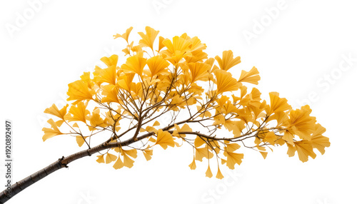 Fototapeta premium Isolated single golden ginkgo tree branch, fan-shaped yellow leaves, clear...