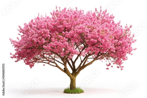 Fototapeta premium Isolated spring tree with pink blossom on white background from high angle view