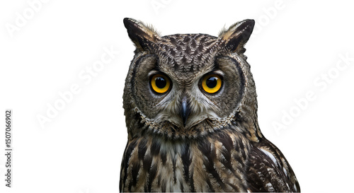 © ScottR, Fototapeta premium Isolated Transparent Background Portrait of a Brown Owl with Yellow Eyes