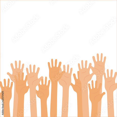 © softulka, Obraz premium Isolated up hands holding together. Teamwork, collaboration, voting, concert. Colorful vector flat illustration concept