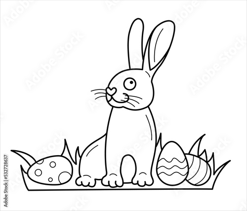 Obraz premium Isolated vector hare with eggs in the grass with black line stroke. Easter,...