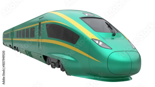 © Ivan, Naklejka premium Isolated view of a high speed train, sleek green exterior with gold stripes, streamlined shape
