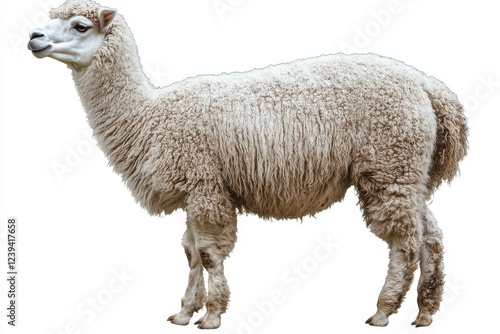 © TuruMuru, Fototapeta premium Isolated white background with medium grey alpaca Lama pacos