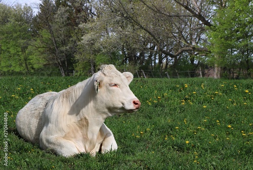 © Diane, Fototapeta premium Isolated white Charolais steer laying in field of dandelions