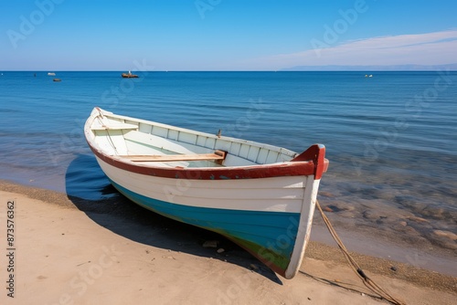 Fototapeta premium Isolated white fishing boat on calm blue lake, creating a serene and peaceful...