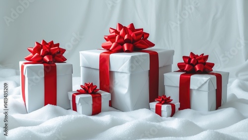© -Quantum Pixels-, Obraz premium Isolated white gift boxes featuring red bows on a background