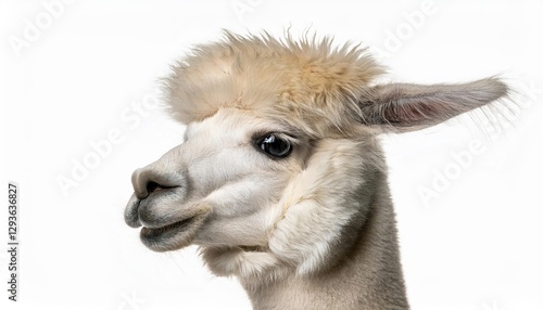 © netsay, Obraz premium Isolated White NineMonthOld Alpaca Lama pacos in a Serene Highland Scene, Capturing Innocence and Softness with its Fluffy White Coat and Expressive Eyes.