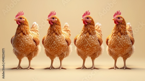 © Dee, Fototapeta premium Isolated white rooster and hen standing on a farm with brown and black feathers, beak, and red comb