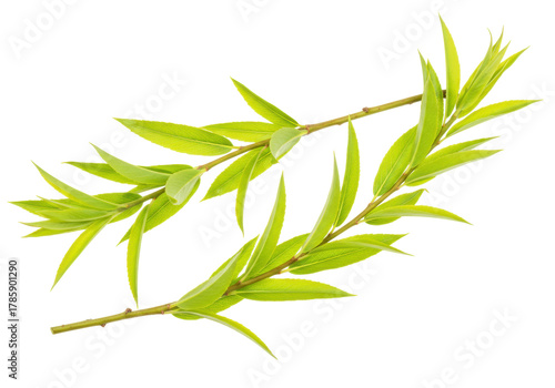 © Michal, Naklejka premium Isolated willow branches with slender green leaves create a fresh and tranquil composition.