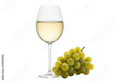 Naklejka premium Isolated wine glass with white wine and a bunch of fresh green grapes...