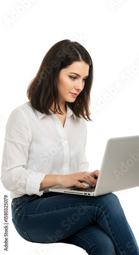 © Heriberto, Fototapeta premium Isolated Young Woman Typing on Laptop in White Shirt and Denim