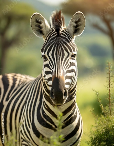 © Artbi, Naklejka premium Isolated zebra with depth of field highlighting unique stripes and majestic stature