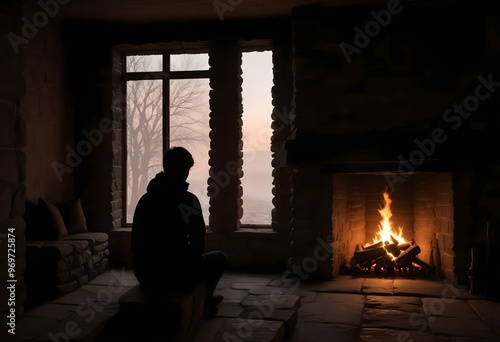 Naklejka premium Isolation and Despair Mental Health Struggles Sadness and Anxiety Silhouette by Fireplace