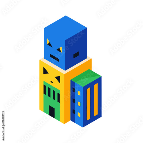 © tham, Obraz premium Isometric angry monster buildings in a stylized urban landscape.