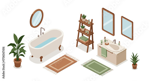 Fototapeta premium Isometric bathroom interior with bathtub, sink, and decorative plants