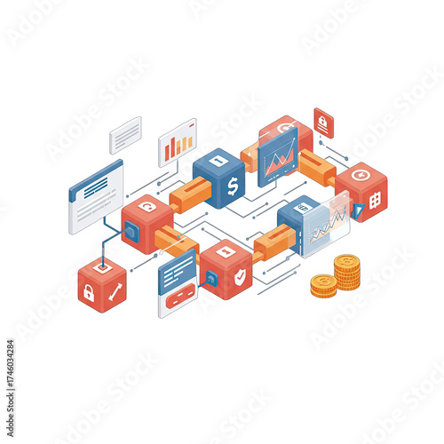 © Widyan, Obraz premium Isometric Blockchain Network with Data Cubes and Transparent Background