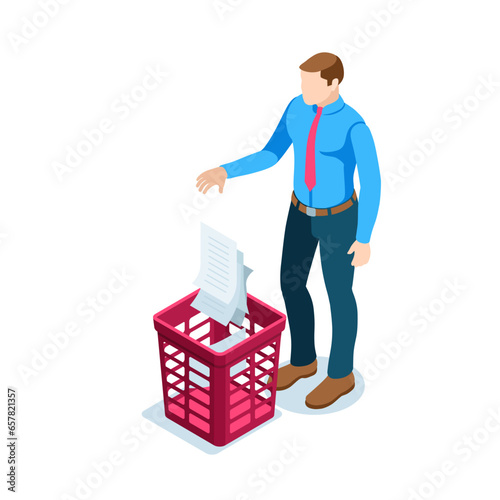 Obraz premium isometric business man throwing papers into the trash bin, in color on a...