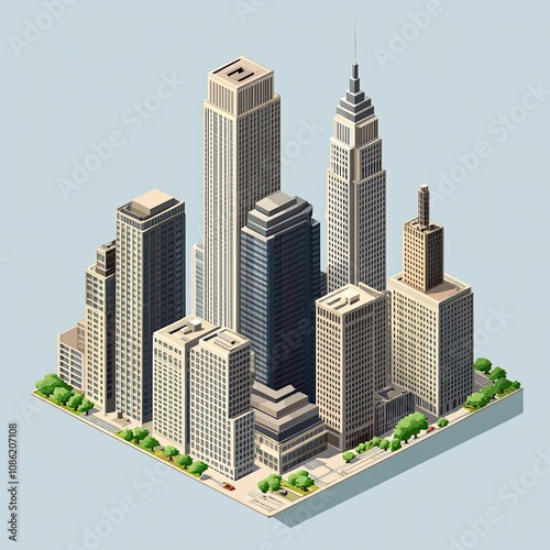 Fototapeta premium Isometric cityscape with tall buildings and trees.