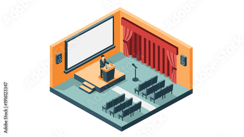 © Mark, Obraz premium Isometric conference room interior with speaker on podium and red curtain stage
