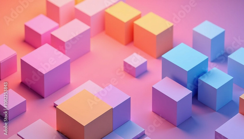 Obraz premium Isometric 3D background with cubes and bright gradients, multi-colored cubes as if floating in space, with shadows and volume, create a modern and abstract look