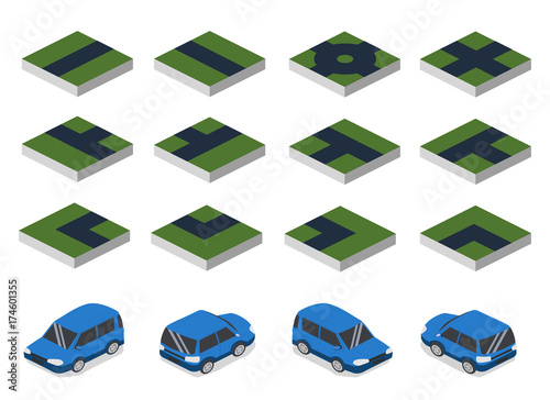 © cathal_shtadler, Naklejka premium Isometric 3D vector illustration concept set collection road and car. Parts of the road and the machine in different angles