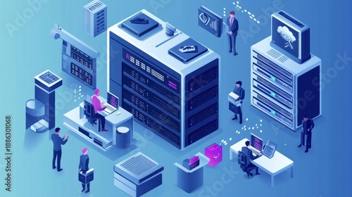 © Aziz, Obraz premium Isometric Data Center with Servers and Technicians.