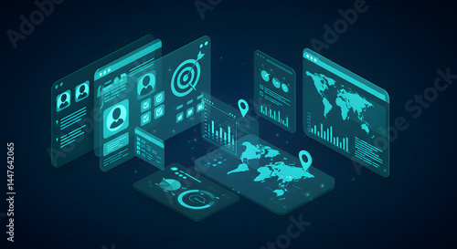 Fototapeta premium Isometric Data Network on Multiple Screens in Blue Tones for Global Analysis and Futuristic Technology