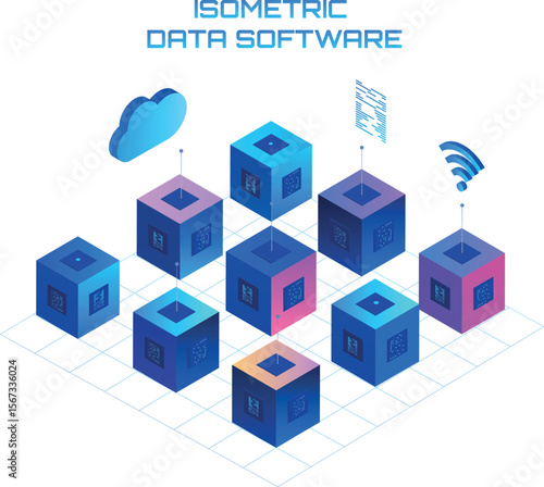 Fototapeta premium Isometric Data Software Cubes. Server. 3d Vector Set of Big Data Center Server. Isometric design for Data center concept, data software connection, concept of cloud storage, data transfer Tech