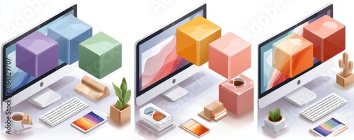 Obraz premium Isometric desktop scene with colorful cubes, plants, and gadgets across three...