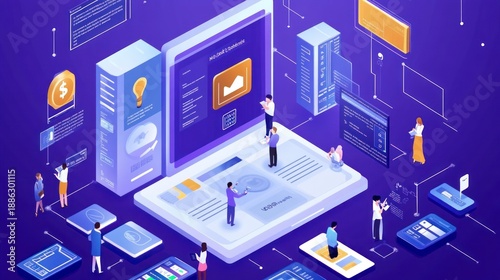Obraz premium Isometric Digital Workspace with Multiple Devices and People.