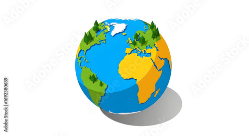© Clear, Fototapeta premium Isometric Earth Globe with Green Trees and Shadow on White Background