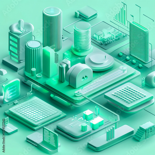Fototapeta premium Isometric futuristic data center in mint green, depicting a digital cityscape...