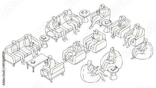 © Fikri, Obraz premium Isometric Group of People Sitting and Relaxing in Various Furniture.