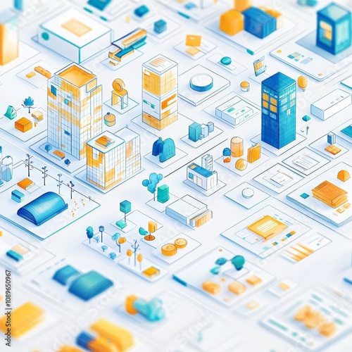 © Napak, Fototapeta premium Isometric Illustration of a Modern Cityscape with Buildings, Trees, and Data Visualization Elements