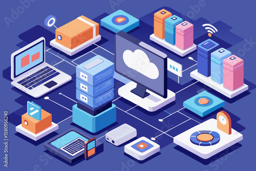 Obraz premium Isometric Illustration of Cloud Computing Network with Servers Laptops and Data Storage