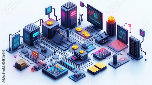 © fanjianhua, Fototapeta premium Isometric illustration of computer components connected by lines.