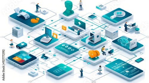 © Arifin Studio, Obraz premium Isometric illustration of interconnected digital devices and human interactions representing a complex system.