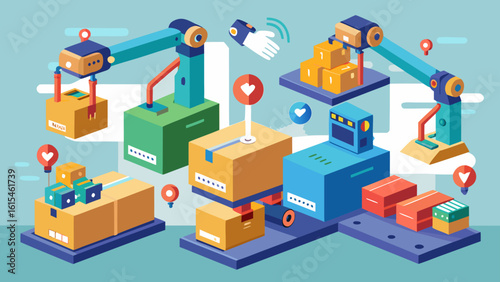 Obraz premium Isometric illustration of robotic arms handling boxes in a modern warehouse...