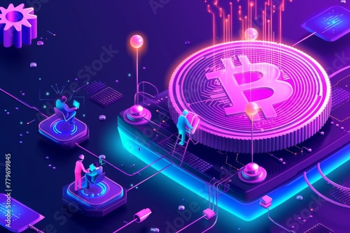 Fototapeta premium Isometric Illustration of Virtual People Interacting with a Bitcoin Concept on a Digital Network.