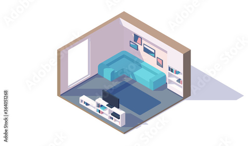 © Voidentir, Obraz premium isometric low poly living room interior, tv, couch, bookshelf, window, carpet, picture, vector illustration
