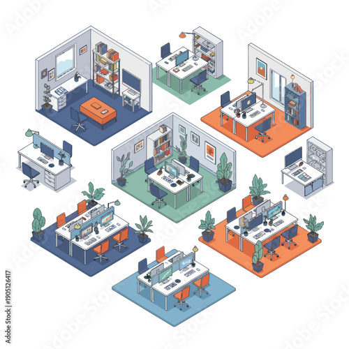 Obraz premium Isometric Office Spaces with Various Workstations and Decor.
