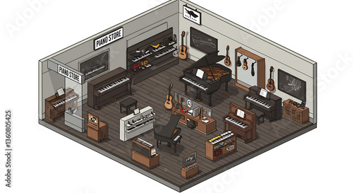 Obraz premium Isometric Piano Store Display with Instruments for Sale Illustration