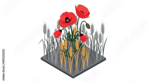© Ophelia, Naklejka premium Isometric poppies and wheat field in bloom with gray background