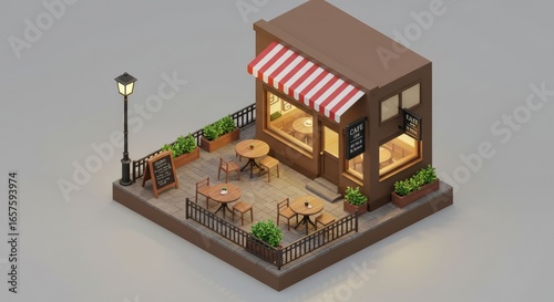 © Fatwaram, Obraz premium Isometric Rendered 3D Cafe Shop Restaurant with Outdoor Seating Illustration